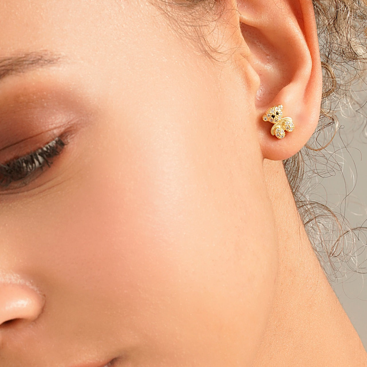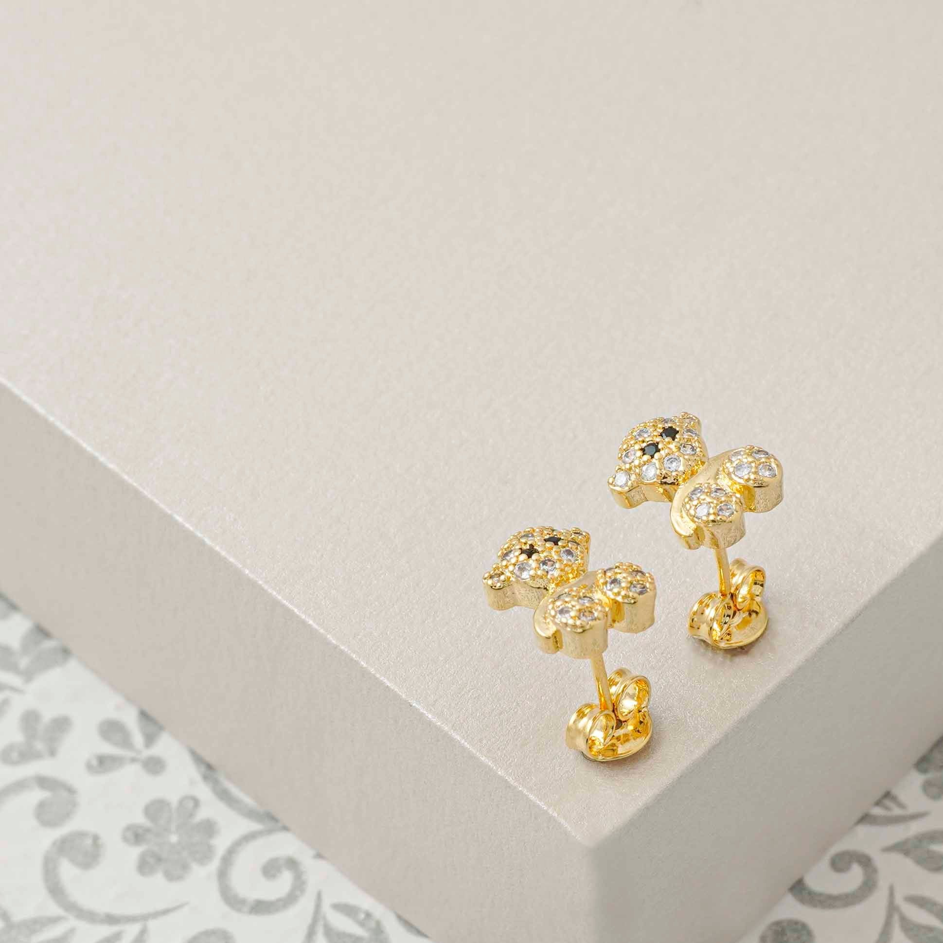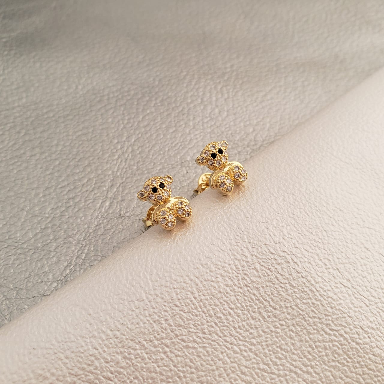 Las prendas y accesorios en Oro Laminado 18k son Semi Joyas, puedes tener y lucir piezas con el color y la textura del oro 18k a un precio más asequible. Nuestros Aretes Osito Circonias están elaborados sobre una aleación de cobre y paladio y sus 3 capas externas son láminas de oro 18k.