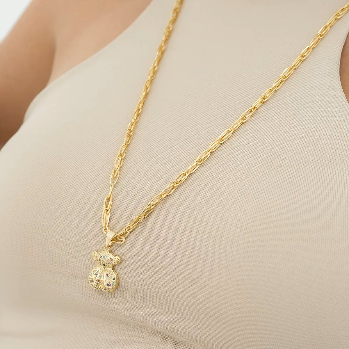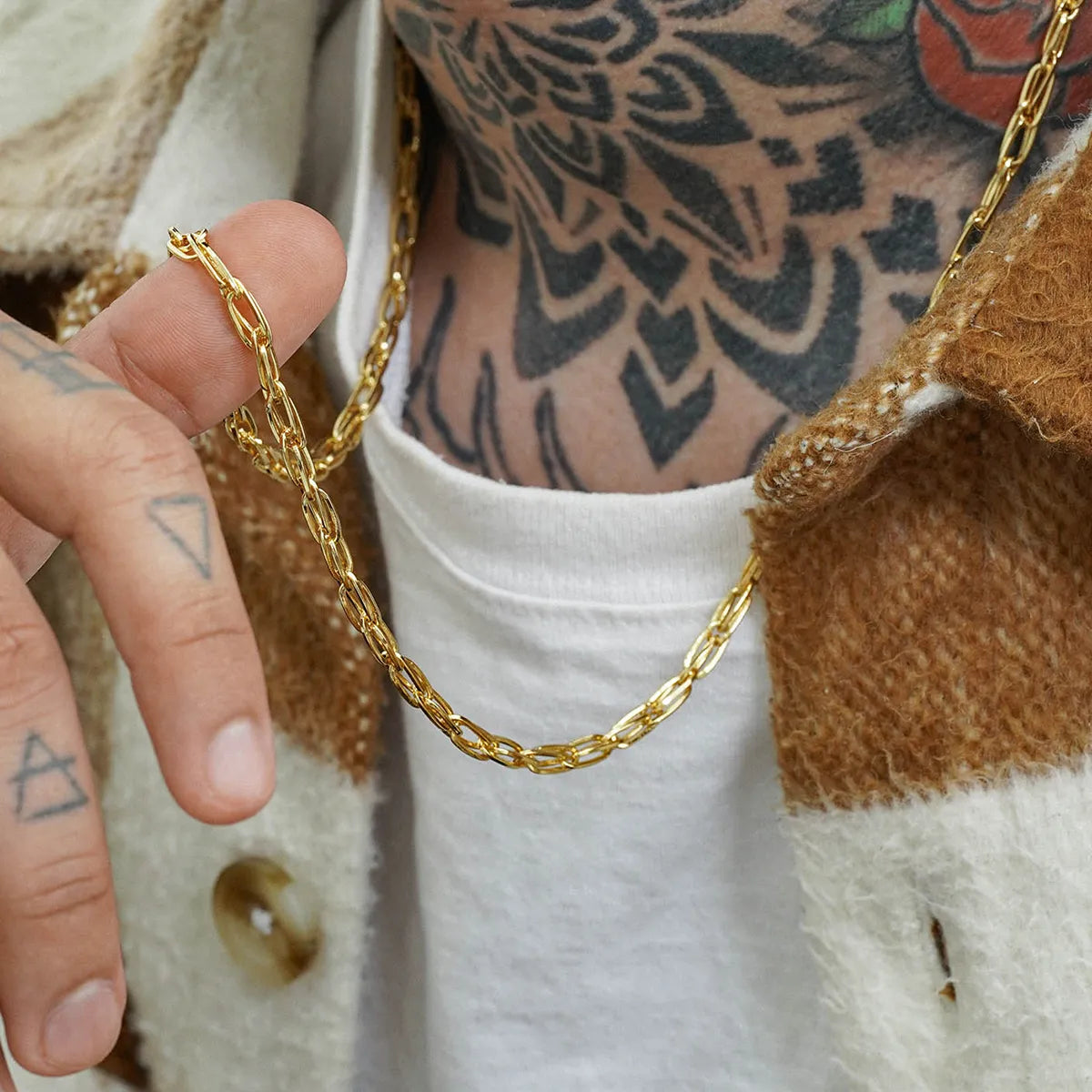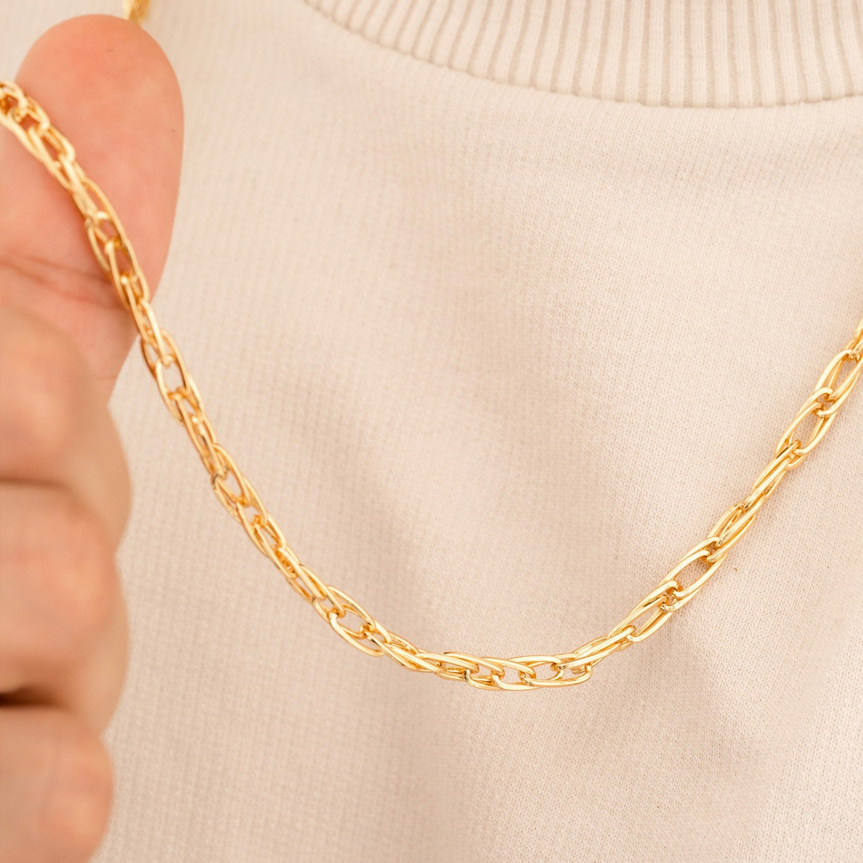 Las prendas y accesorios en Oro Laminado 18k son Semi Joyas, puedes tener y lucir piezas con el color y la textura del oro 18k a un precio más asequible. Nuestra Cadena Candado 65 Cms esta elaborada sobre una aleación de cobre y paladio y sus 3 capas externas son láminas de oro 18k.