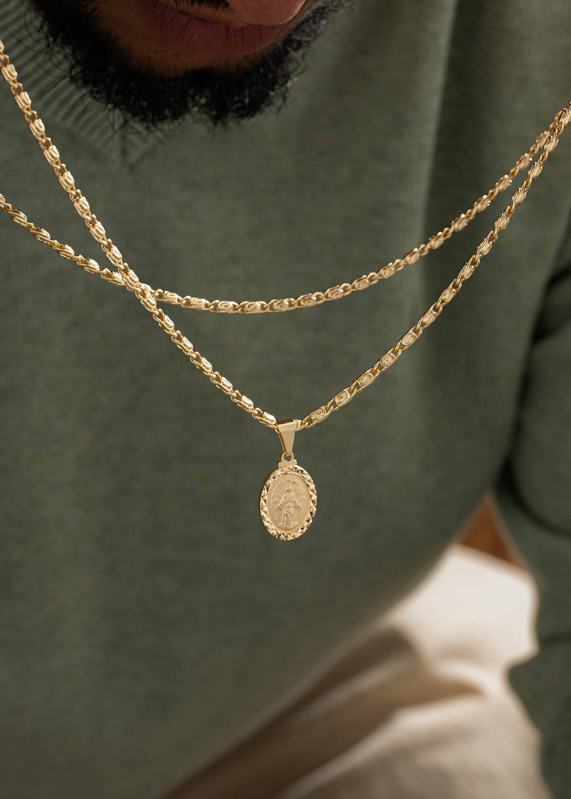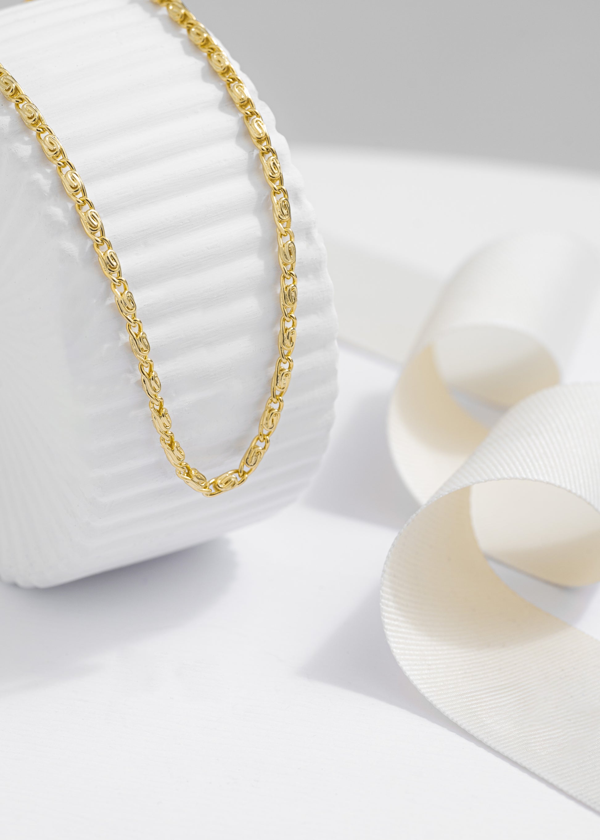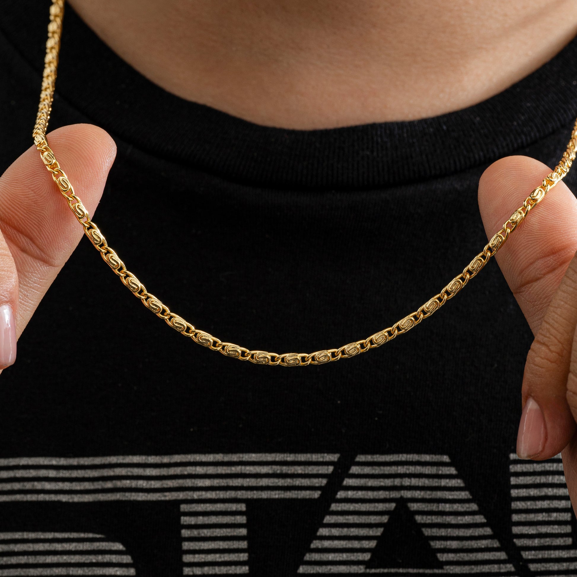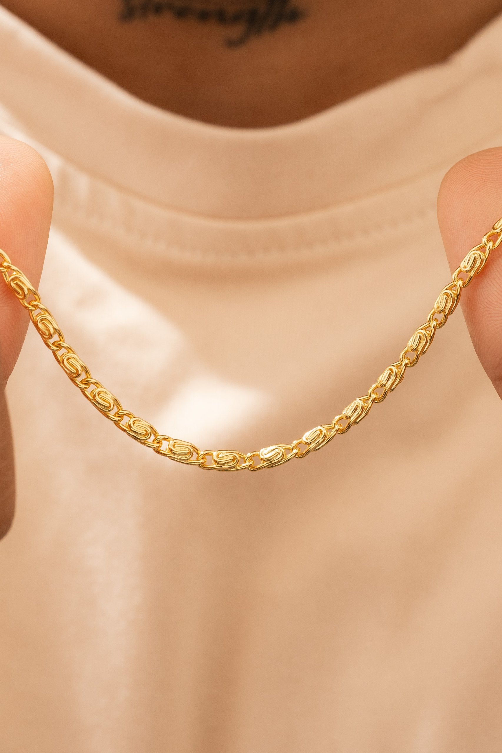 Las prendas y accesorios en Oro Laminado 18k son Semi Joyas, puedes tener y lucir piezas con el color y la textura del oro 18k a un precio más asequible. Nuestra Cadena Caracol Gruesa 65 Cms esta elaborada sobre una aleación de cobre y paladio y sus 3 capas externas son láminas de oro 18k.