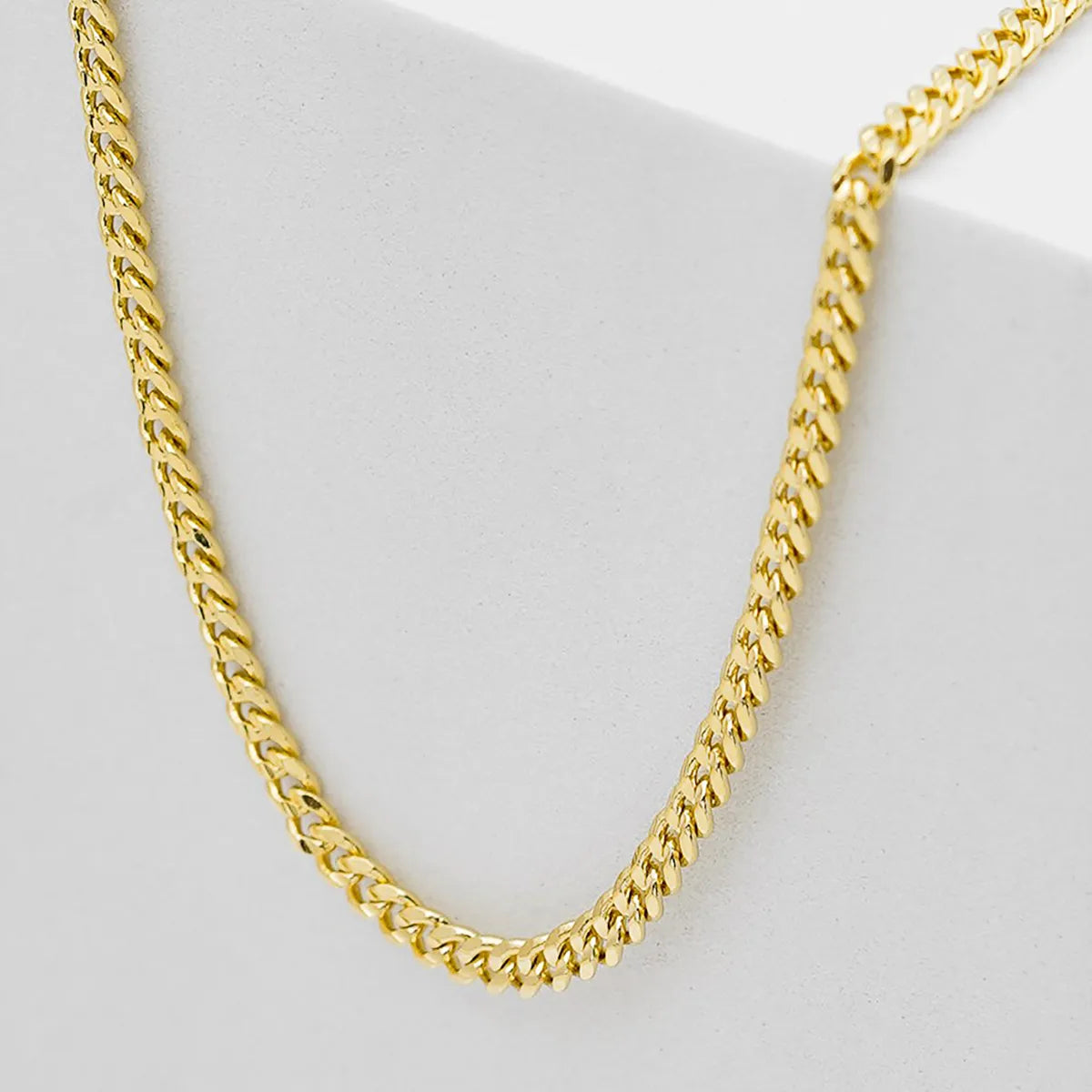 Las prendas y accesorios en Oro Laminado 18k son Semi Joyas, puedes tener y lucir piezas con el color y la textura del oro 18k a un precio más asequible. Nuestra Cadena Cubana Eslabon U 3 mm 45 Cms esta elaborada sobre una aleación de cobre y paladio y sus 3 capas externas son láminas de oro 18k.