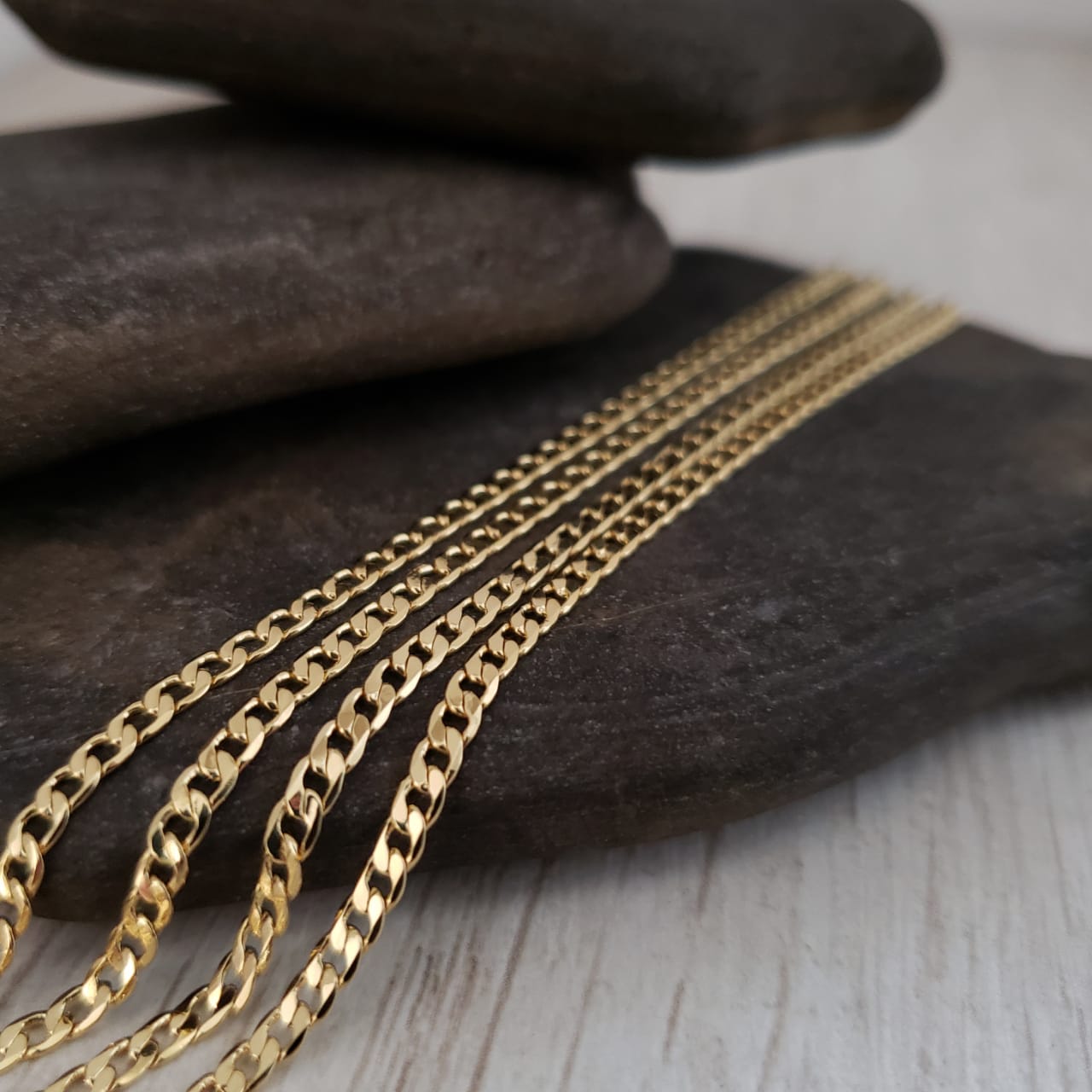 Las prendas y accesorios en Oro Laminado 18k son Semi Joyas, puedes tener y lucir piezas con el color y la textura del oro 18k a un precio más asequible. Nuestra Cadena Cubana Plana Diamantada 65cm esta elaborada sobre una aleación de cobre y paladio y sus 3 capas externas son láminas de oro 18k.