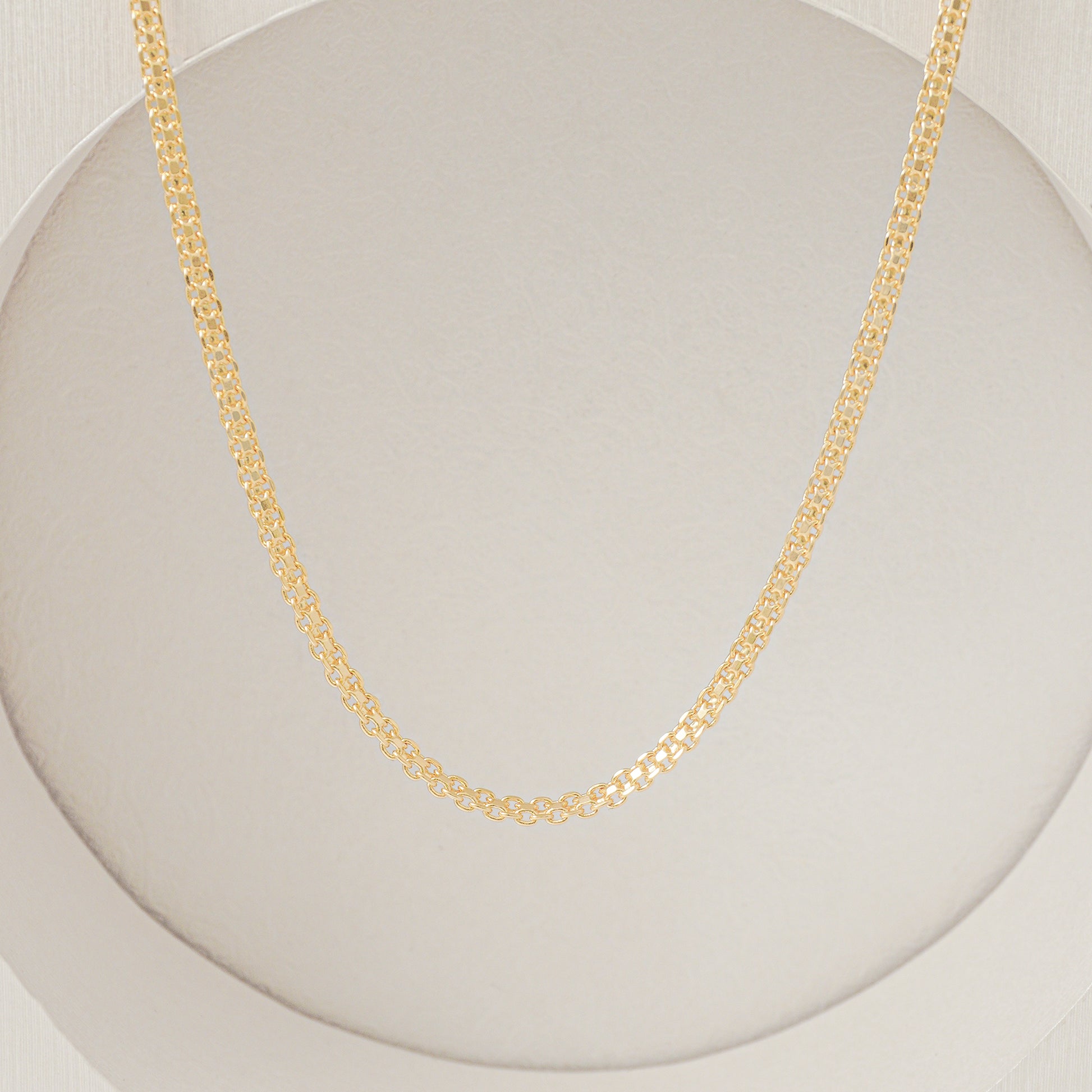 Las prendas y accesorios en Oro Laminado 18k son Semi Joyas, puedes tener y lucir piezas con el color y la textura del oro 18k a un precio más asequible. Nuestra Cadena Tejido Chino 3 mm 45 Cms esta elaborada sobre una aleación de cobre y paladio y sus 3 capas externas son láminas de oro 18k.