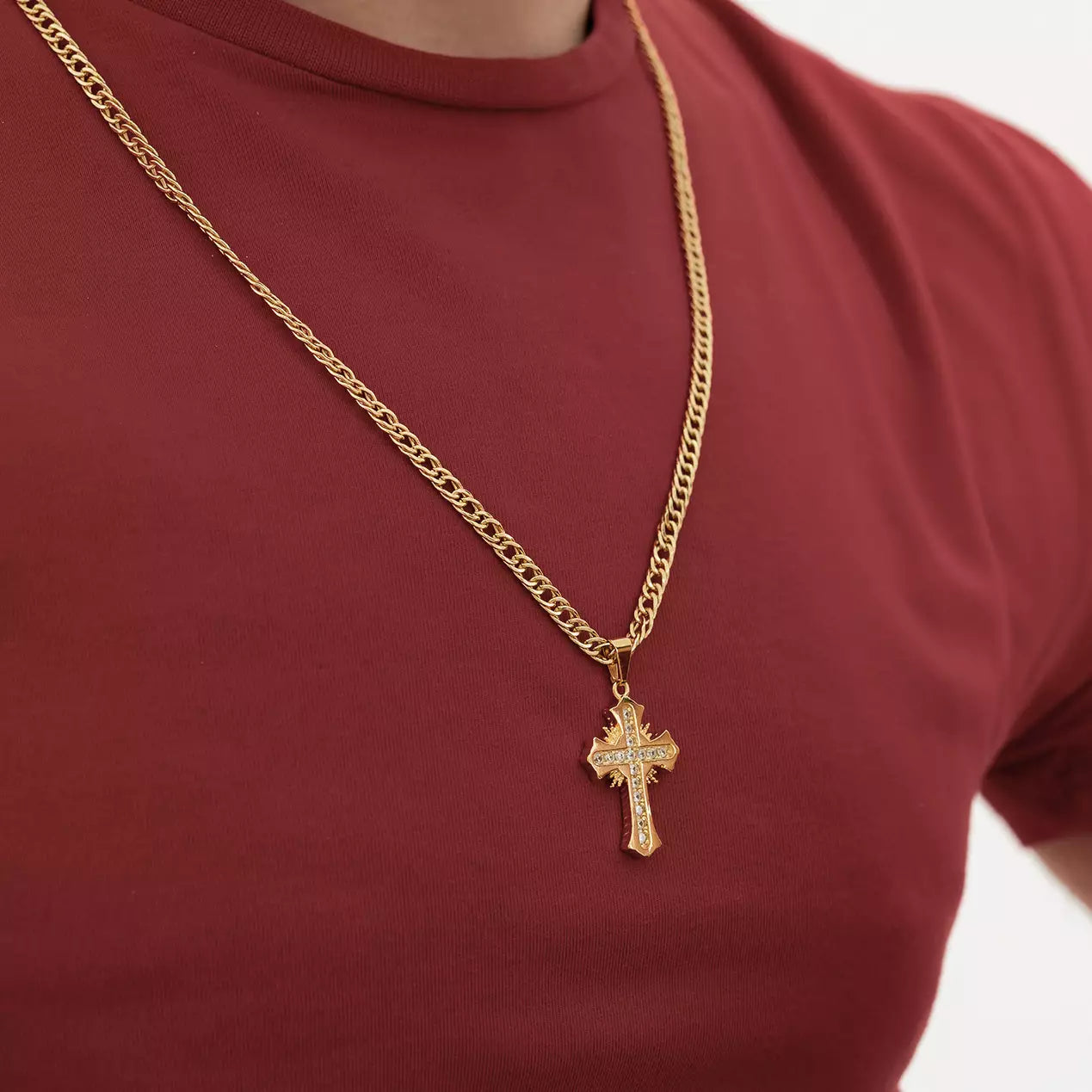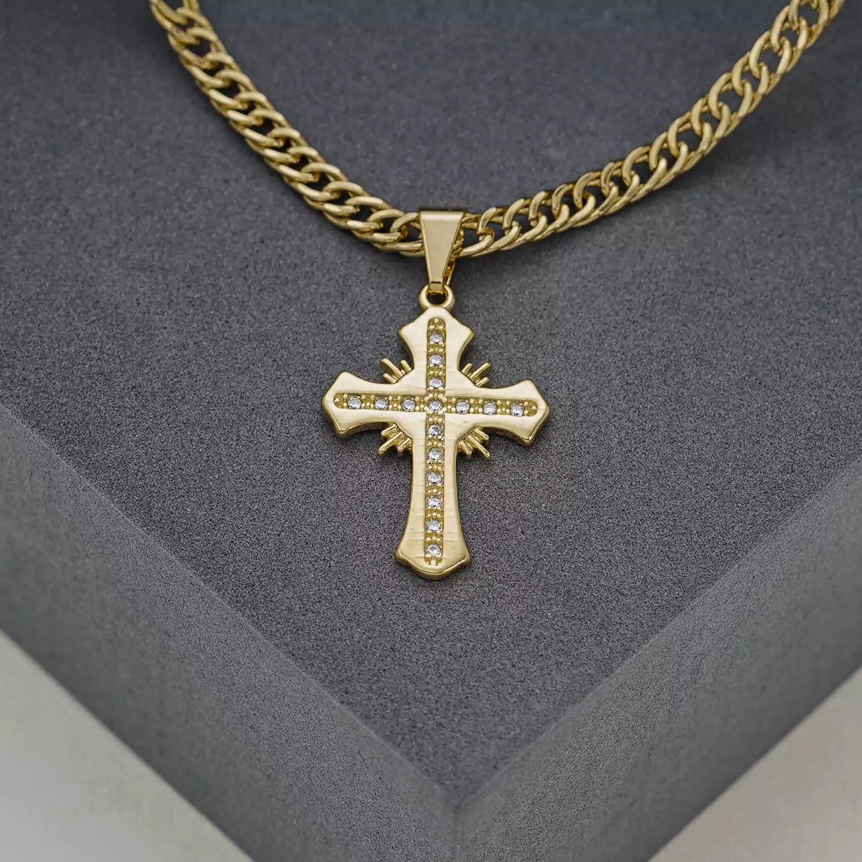 Las prendas y accesorios en Oro Laminado 18k son Semi Joyas, puedes tener y lucir piezas con el color y la textura del oro 18k a un precio más asequible. Nuestro Dije Cruz Sagrada Circonias Cristal está elaborado sobre una aleación de cobre y paladio y sus 3 capas externas son láminas de oro 18k.