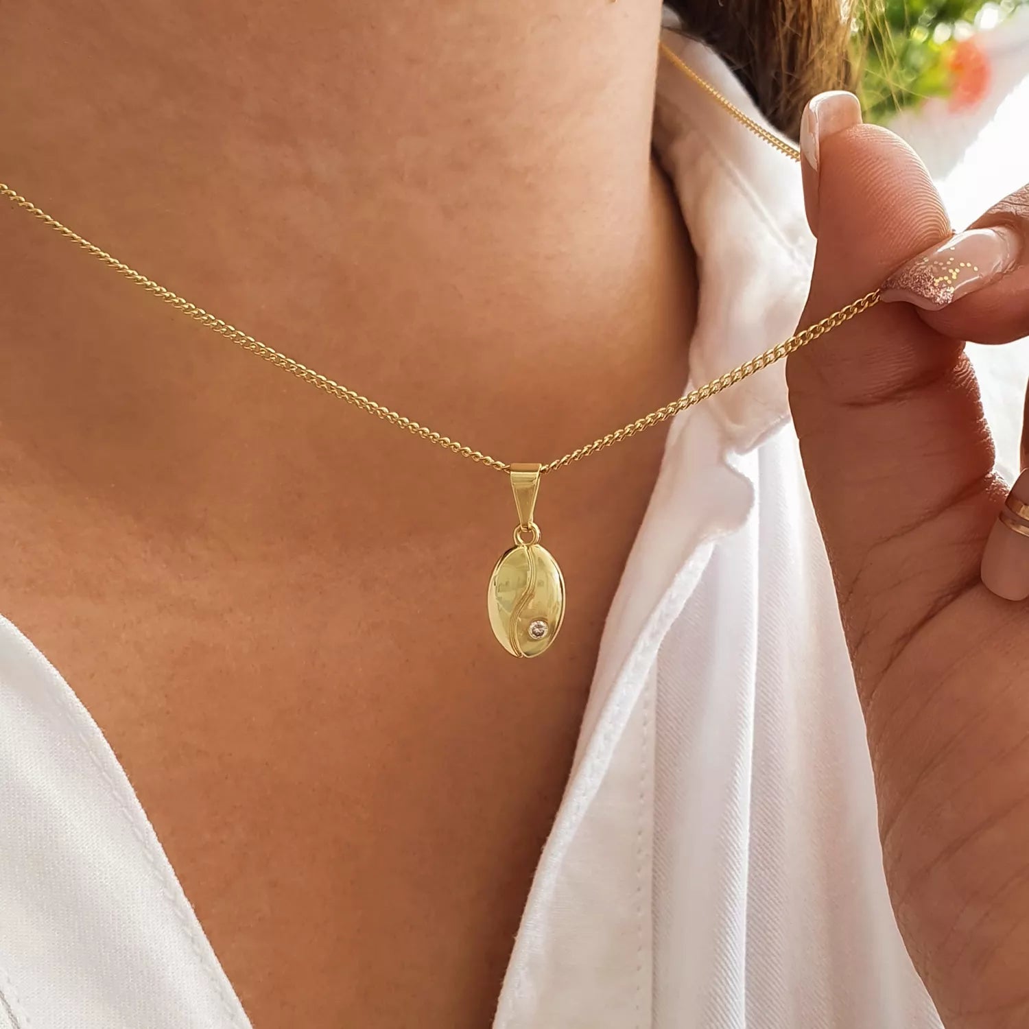 Las prendas y accesorios en Oro Laminado 18k son Semi Joyas, puedes tener y lucir piezas con el color y la textura del oro 18k a un precio más asequible. Nuestro Dije Grano de Cafe Cristal está elaborado sobre una aleación de cobre y paladio y sus 3 capas externas son láminas de oro 18k.