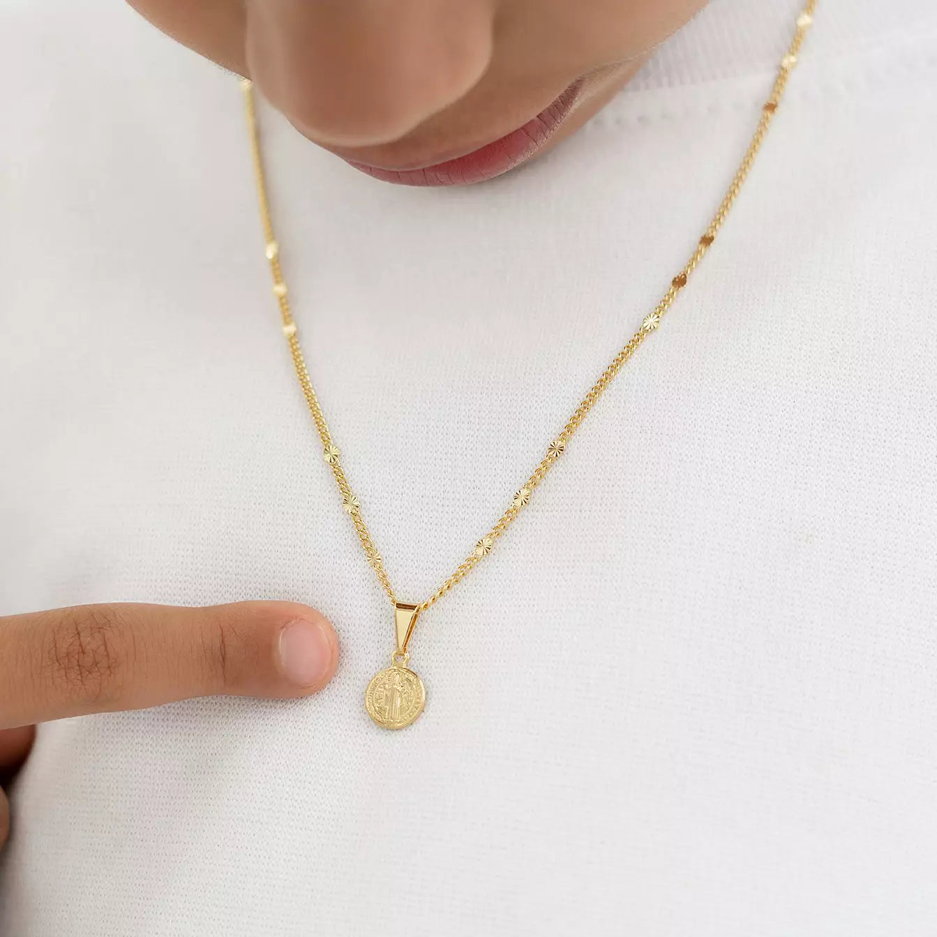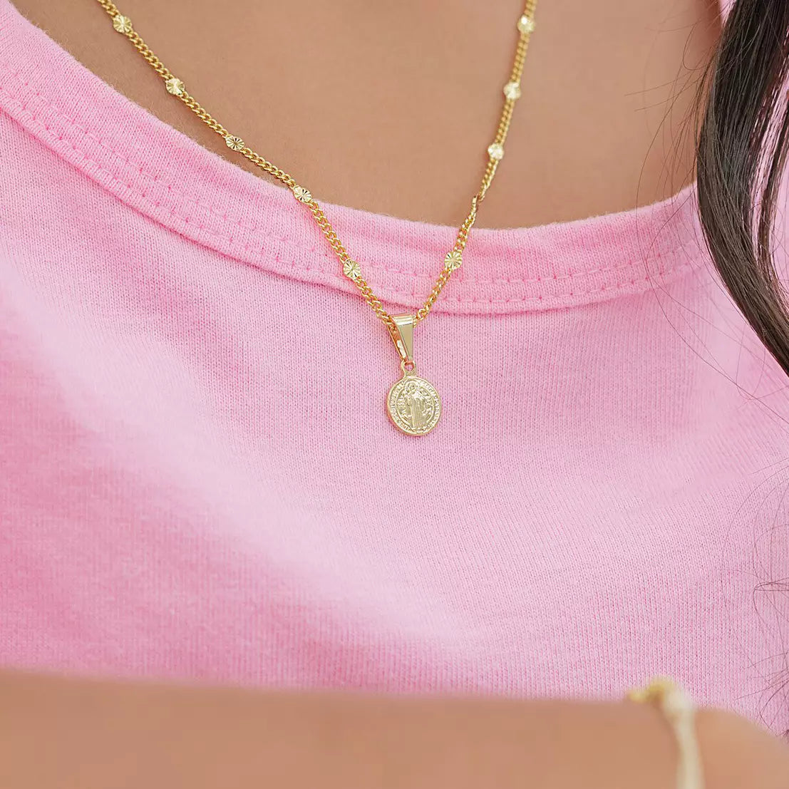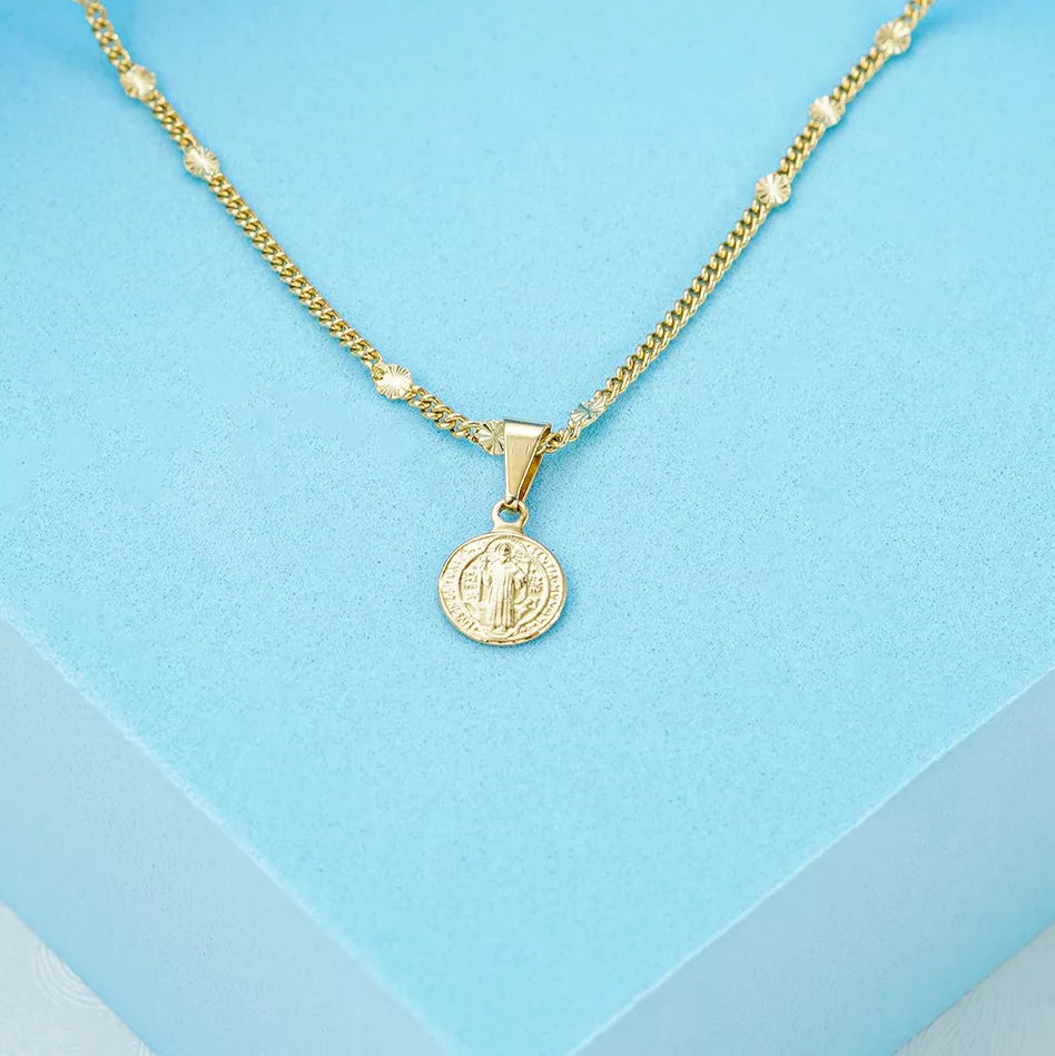 Las prendas y accesorios en Oro Laminado 18k son Semi Joyas, puedes tener y lucir piezas con el color y la textura del oro 18k a un precio más asequible. Nuestro Dije San Benito Red Pequeño está elaborado sobre una aleación de cobre y paladio y sus 3 capas externas son láminas de oro 18k.