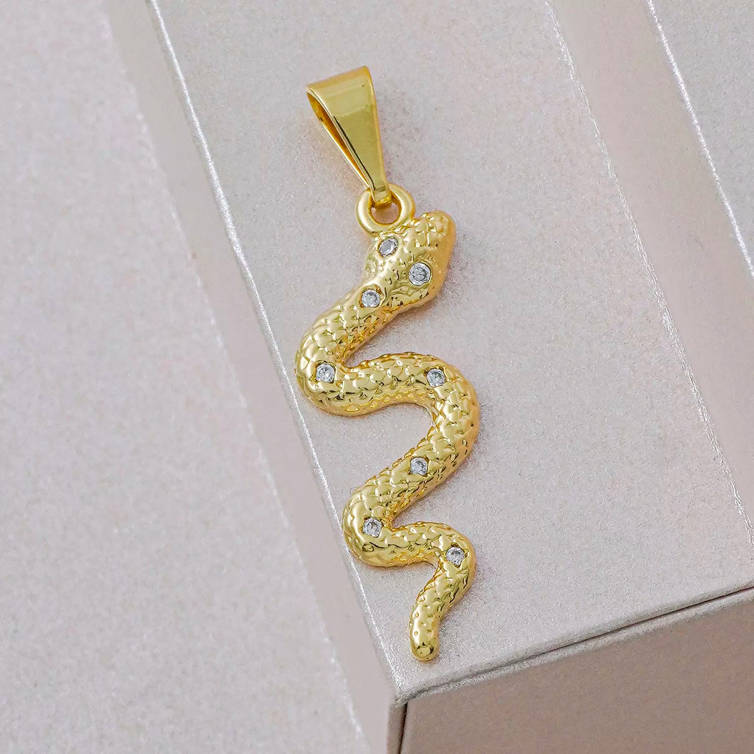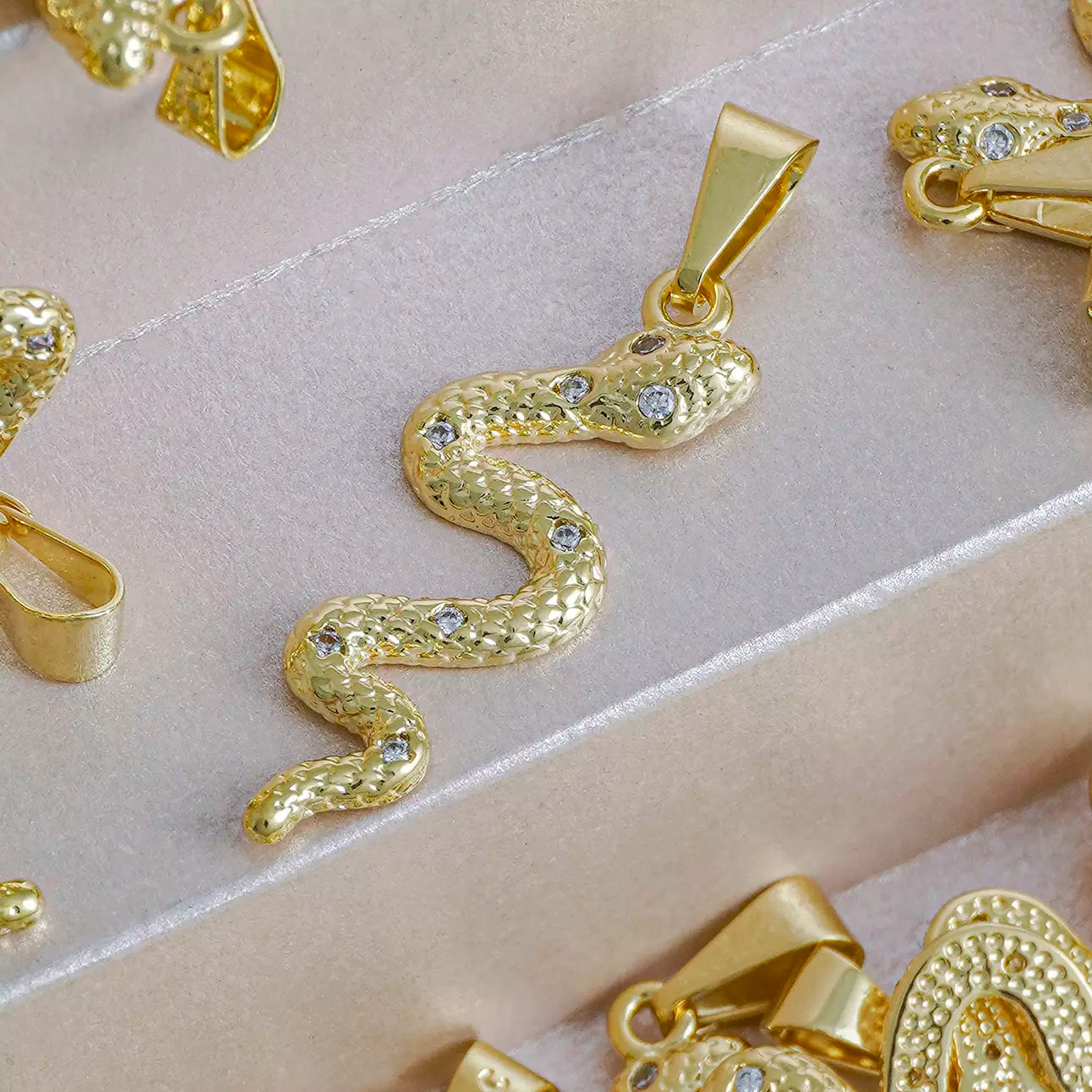 Las prendas y accesorios en Oro Laminado 18k son Semi Joyas, puedes tener y lucir piezas con el color y la textura del oro 18k a un precio más asequible. Nuestro Dije Serpiente Cristal está elaborado sobre una aleación de cobre y paladio y sus 3 capas externas son láminas de oro 18k.