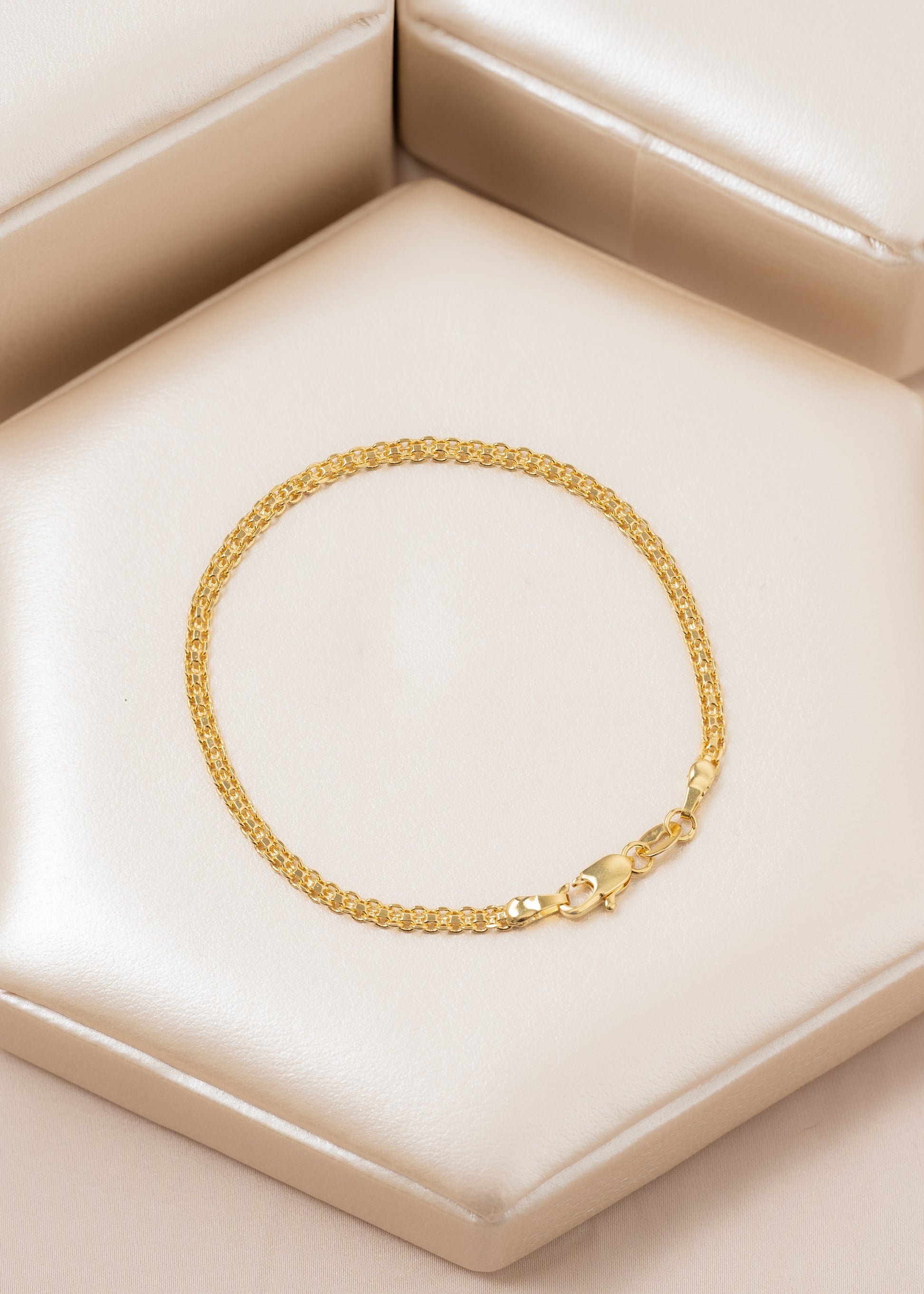 Las prendas y accesorios en Oro Laminado 18k son Semi Joyas, puedes tener y lucir piezas con el color y la textura del oro 18k a un precio más asequible. Nuestra Pulsera Tejido Chino 3 Mm 18.5 Cms esta elaborada sobre una aleación de cobre y paladio y sus 3 capas externas son láminas de oro 18k.