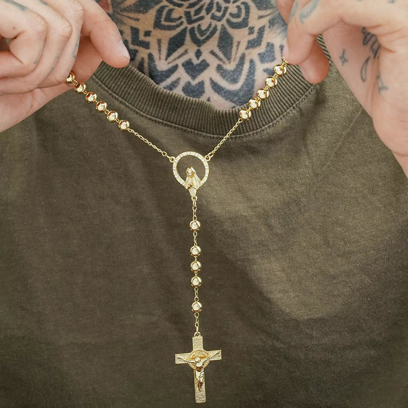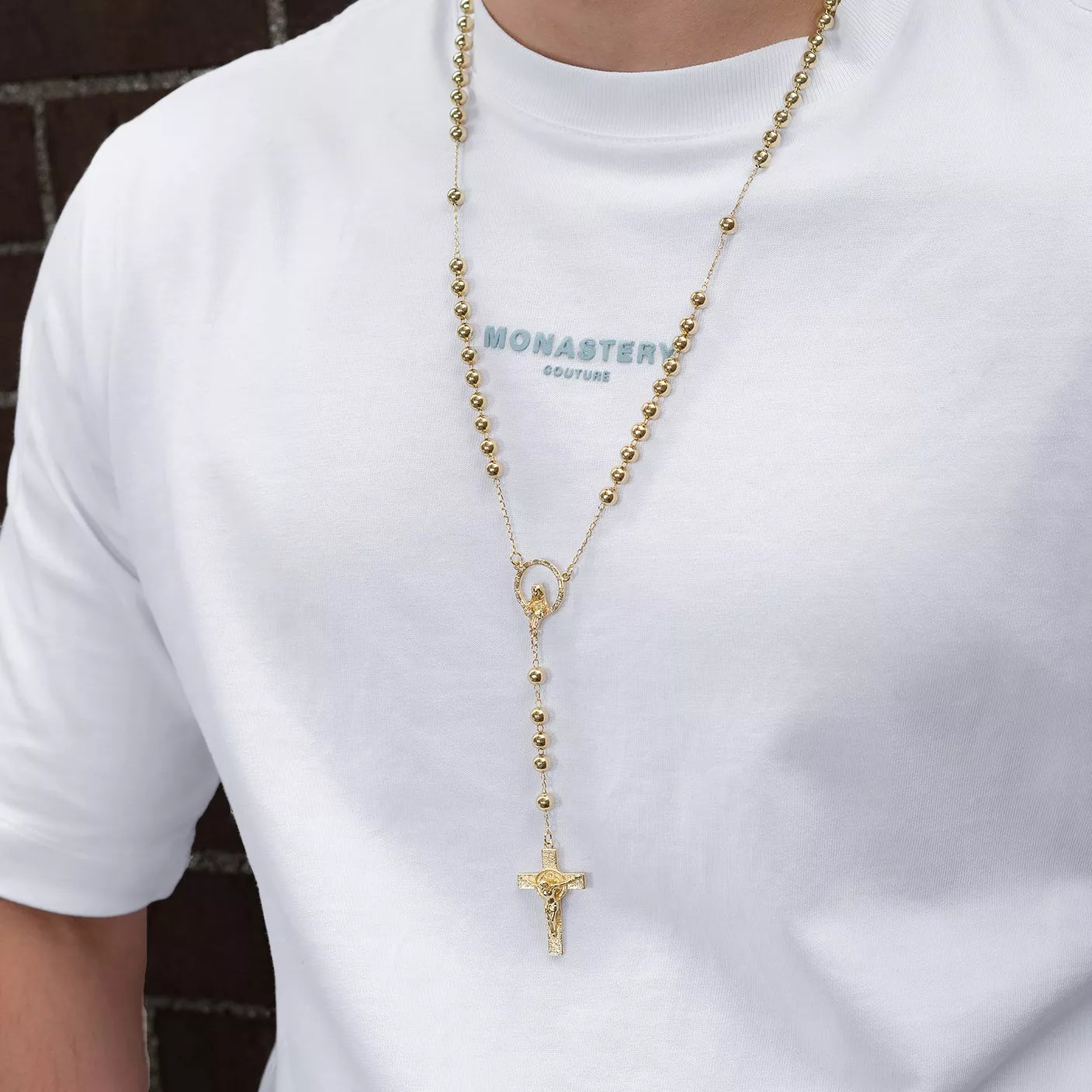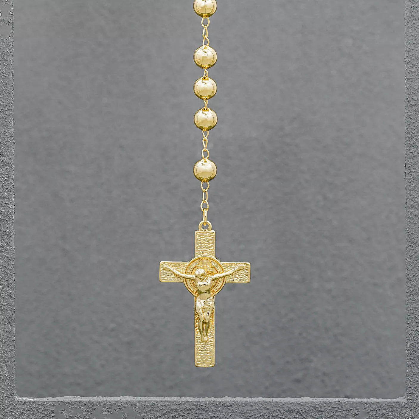 Las prendas y accesorios en Oro Laminado 18k son Semi Joyas, puedes tener y lucir piezas con el color y la textura del oro 18k a un precio más asequible. Nuestro Rosario Hombre 65 Cms 6 mm está elaborados sobre una aleación de cobre y paladio y sus 3 capas externas son láminas de oro 18k.