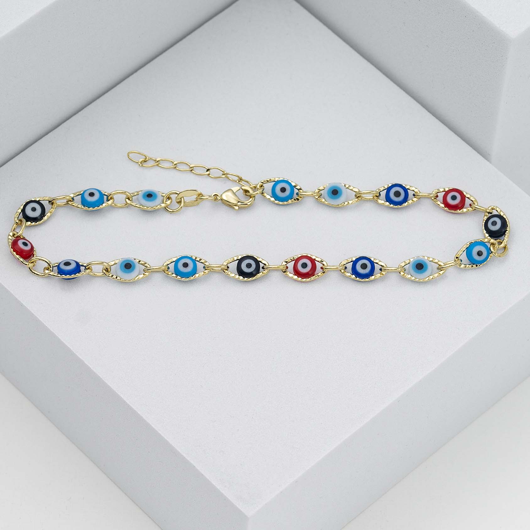 Las prendas y accesorios en Oro Laminado 18k son Semi Joyas, puedes tener y lucir piezas con el color y la textura del oro 18k a un precio más asequible. Nuestra Tobillera Ojo Turco Multicolor 23 Cms + 2 Cms Extensor esta elaborada sobre una aleación de cobre y paladio y sus 3 capas externas son láminas de oro 18k.